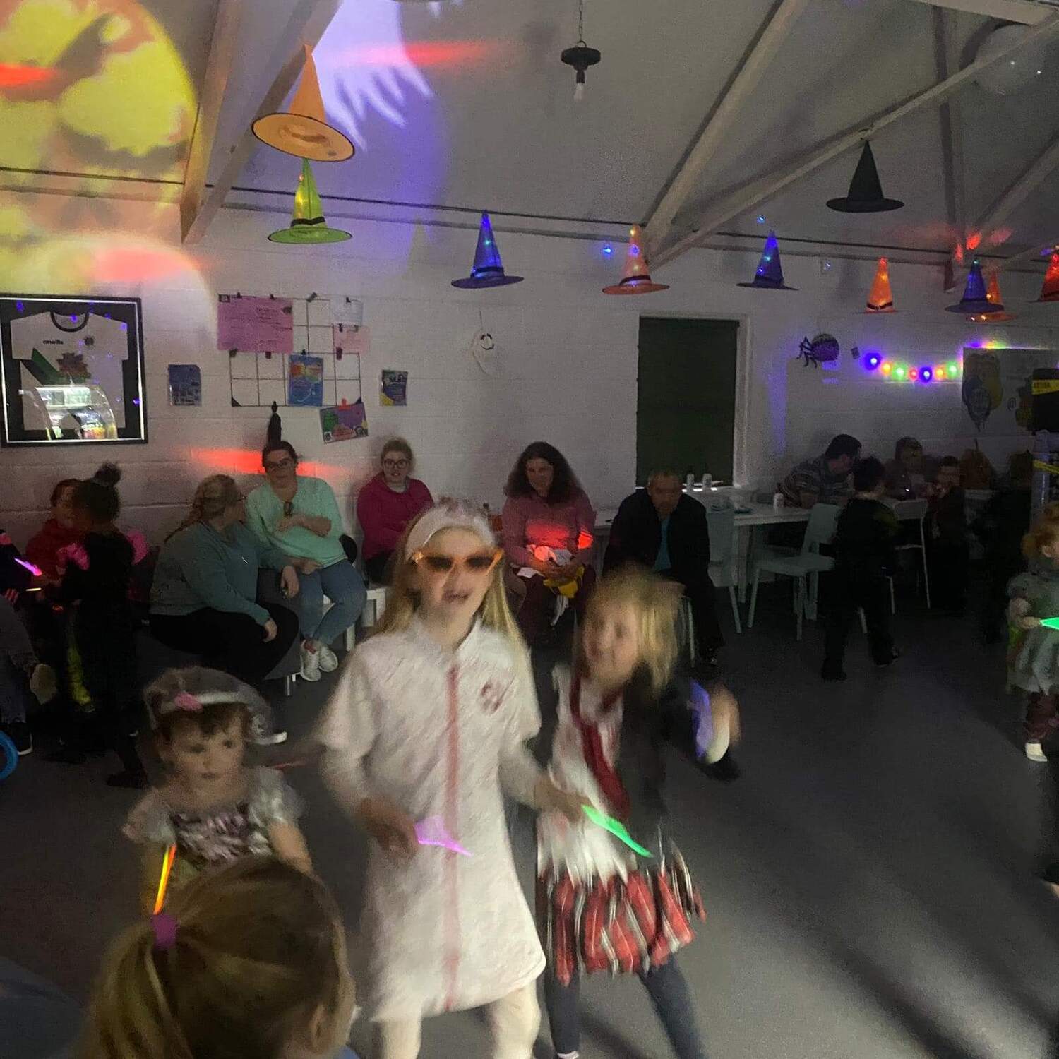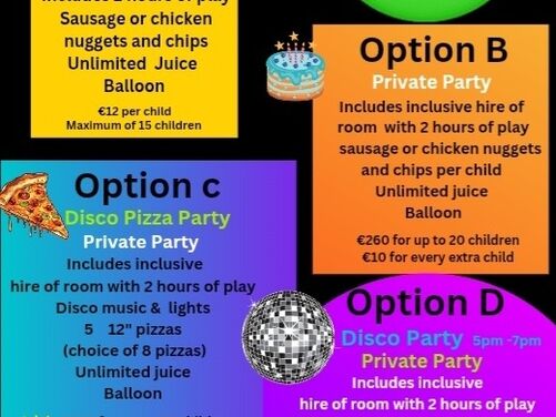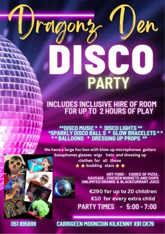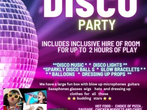 Option D . Disco Party which includes inclusive hire of room for up to 2 hours of play . Pizza or chicken Nuggets or sausage and chips . Unlimited juice. Disco music & lights . Disco balls. Glow sticks, balloons and dressing up props .
